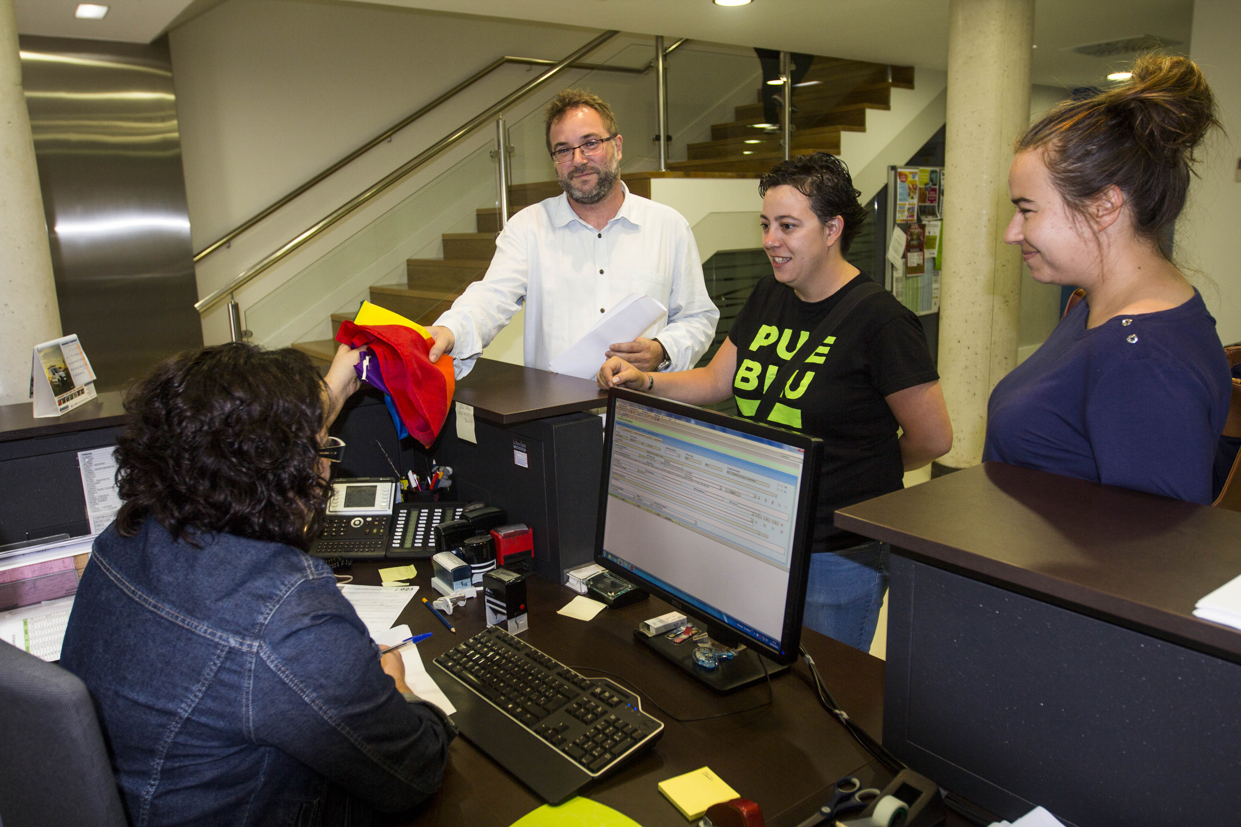 Xente de PUEBLU cola arcoíris antes de rexistrar la so entrada nel consistoriu llocal.